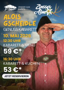 Schwäbische Comedy trifft Kulinarik: Alois Gscheidle bringt sein Genuss Kabarett in die Zinsser Alm! Freut euch auf jede Menge Lacher und schwäbischen Wortwitz vom Feinsten. Ihr habt die Wahl zwischen zwei Terminen: mittags um 12:30 Uhr mit 3-Gänge-Menü oder nachmittags um 16:30 Uhr mit Kaffee und Kuchen.