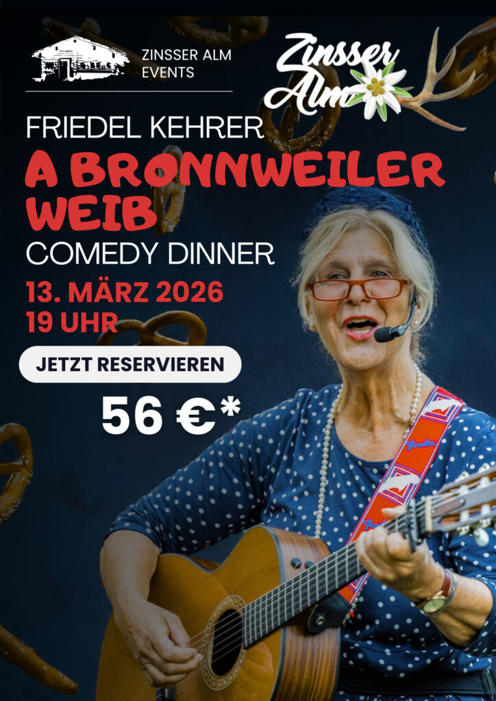 Ein schwäbisches Original durch und durch kommt in die Zinsser Alm! Friedel Kehrer begeistert als Komödiantin und Liedermacherin mit schwäbischem Kabarett vom Feinsten.