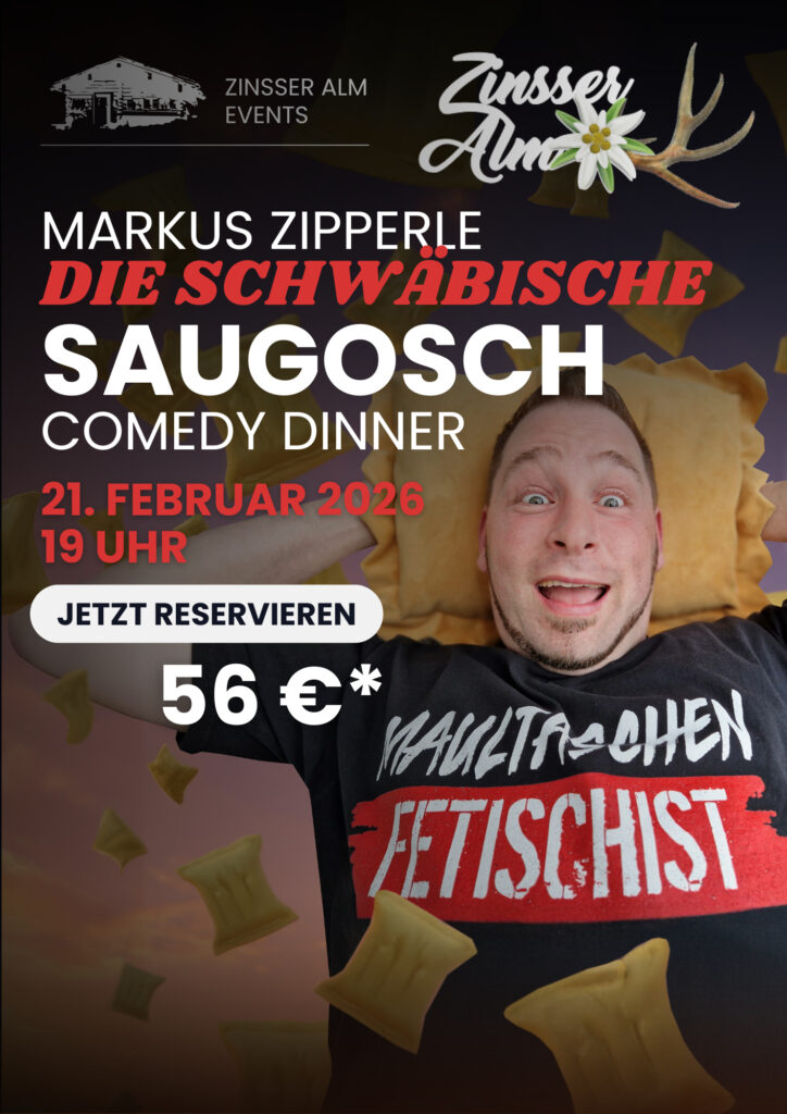 Der Herr der Maultaschen startet den Lachangriff in der Zinsser Alm! Seit über 20 Jahren tourt Markus Zipperle durchs Ländle und begeistert mit seinem Mix aus Stand-Up-Comedy, Improvisationen und schwäbischen Gesangsnummern.